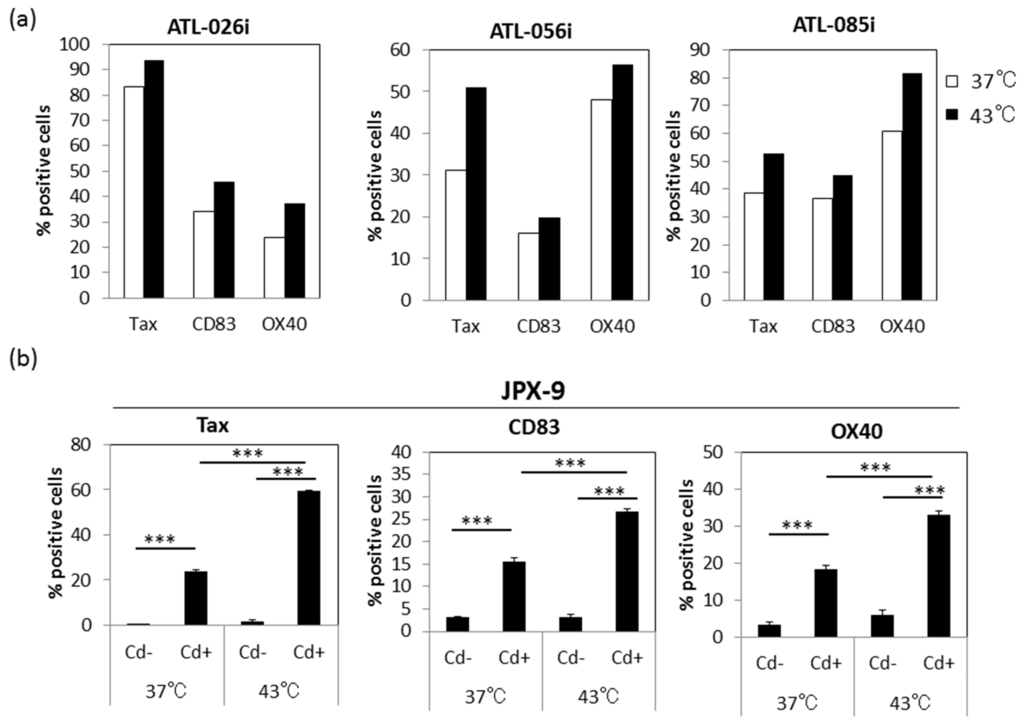 The up-regulation of the expression of Tax-inducible host antigens by exposure to HS: The ATL-derived CD4+ T cell lines (a) and JPX-9 cell line (b) were either exposed to HS or mock treated, and then cultured for 24 h in the presence or absence 1 μM Cd (Tax inducing agent in JPX-9 cells). The frequencies (%) of Tax antigen and Tax-inducible host antigens including CD83 and OX40 expressing cells were analyzed by FCM. Data shown are representative of three independent experiments. In (b), experiments were performed in triplicates, with incubation in media alone (Cd-) or media containing Cd (Cd+) and the frequencies of Tax, CD83 and OX40 cells determined. The means ± SD values are shown. *** p < 0.001.