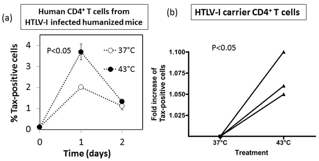 Finally, we examined the effect of HS exposure on HTLV-I-infected primary human CD4+ T cells, including those obtained from HTLV-I-infected humanized NOG mice and HTLV-I carriers. As shown in Figure 7a, exposure to HS resulted in significant increase in the frequencies of Tax+ CD4+ T cells after in vitro culture for 24 h (p < 0.05), that returned to control levels by 48 h. Figure 7b shows that exposure to HS resulted in increase in the expression of Tax antigen in primary CD4+ T cells from three HTLV-I carriers (p < 0.05). Representative dot blots are shown in Supplemental Figure S5. Taken together, these data support the view that HTLV-I activation by exposure to HS is a general phenomenon rather than restricted to having effects on long-term cultured cell lines.