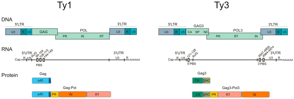 Ty1 and Ty3 share many important structural and functional characteristics. The elements are similar in size; integrated full-length Ty1 is 5.9 kb, and the Ty3 element is 5.4 kb in length. Both elements contain two overlapping open reading frames (ORFs), GAG and POL, flanked by long terminal repeats (LTRs) [,,,] (Figure 1). The GAG ORF encodes the Gag capsid-like protein, while the POL ORF encodes enzymes required for Gag and Gag-Pol maturation (protease (PR)), retrotransposon replication (reverse transcriptase (RT)) and integration into the host genome (integrase (IN)). Organization of the Ty3 POL3 ORF is akin to that of retroviruses (PR-RT-IN) while the Ty1 POL ORF sequence order is PR-IN-RT [,,].