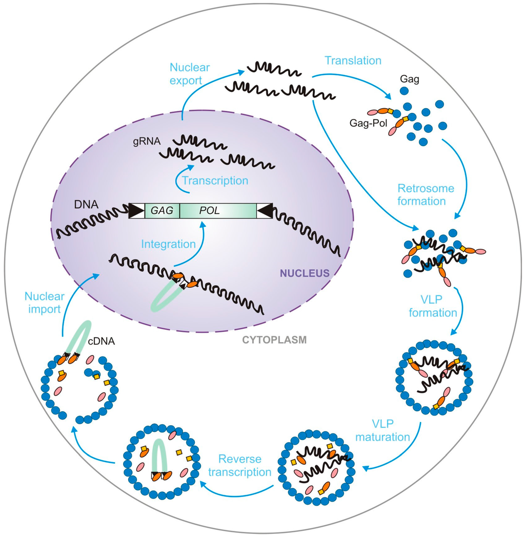 Ty replication cycle with the major steps of retrotransposition outlined. Ty element is transcribed by host cell machinery. The RNA is exported to the cytoplasm and translated into Gag and Gag-Pol. Ty RNA, Gag, and Gag-Pol associate to form retrosomes where dimeric Ty genomic RNA and tRNAiMet are encapsidated into the VLP. Cleavage of Gag and Gag-Pol proteins by the Ty protease leads to VLP maturation. Ty RNA is reverse transcribed and cDNA is integrated into the host genome.