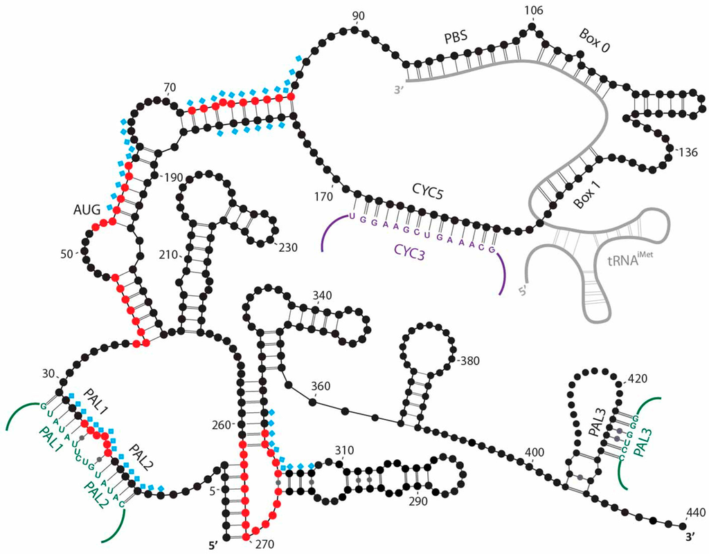 Secondary structure model of the 5′ end of Ty1 genomic RNA derived from structural analysis in different biological states by selective 2'-hydroxyl acylation analyzed by primer extension (SHAPE) []. Nucleotide positions at which SHAPE reactivities increased when proteins were gently removed from VLP-associated Ty1 genomic RNA are marked with blue diamonds. Those positions most likely correspond to Gag binding sites within the dimeric Ty1 genomic RNA in VLPs. Regions in monomeric Ty1 RNA mapped in vitro as binding sites for Gag C-terminal region are represented in red []. Palindromic (PAL) sequences, including reciprocal interstrand interactions are annotated in green [], and cyclization mediated by CYC5 and CYC3 in violet [].