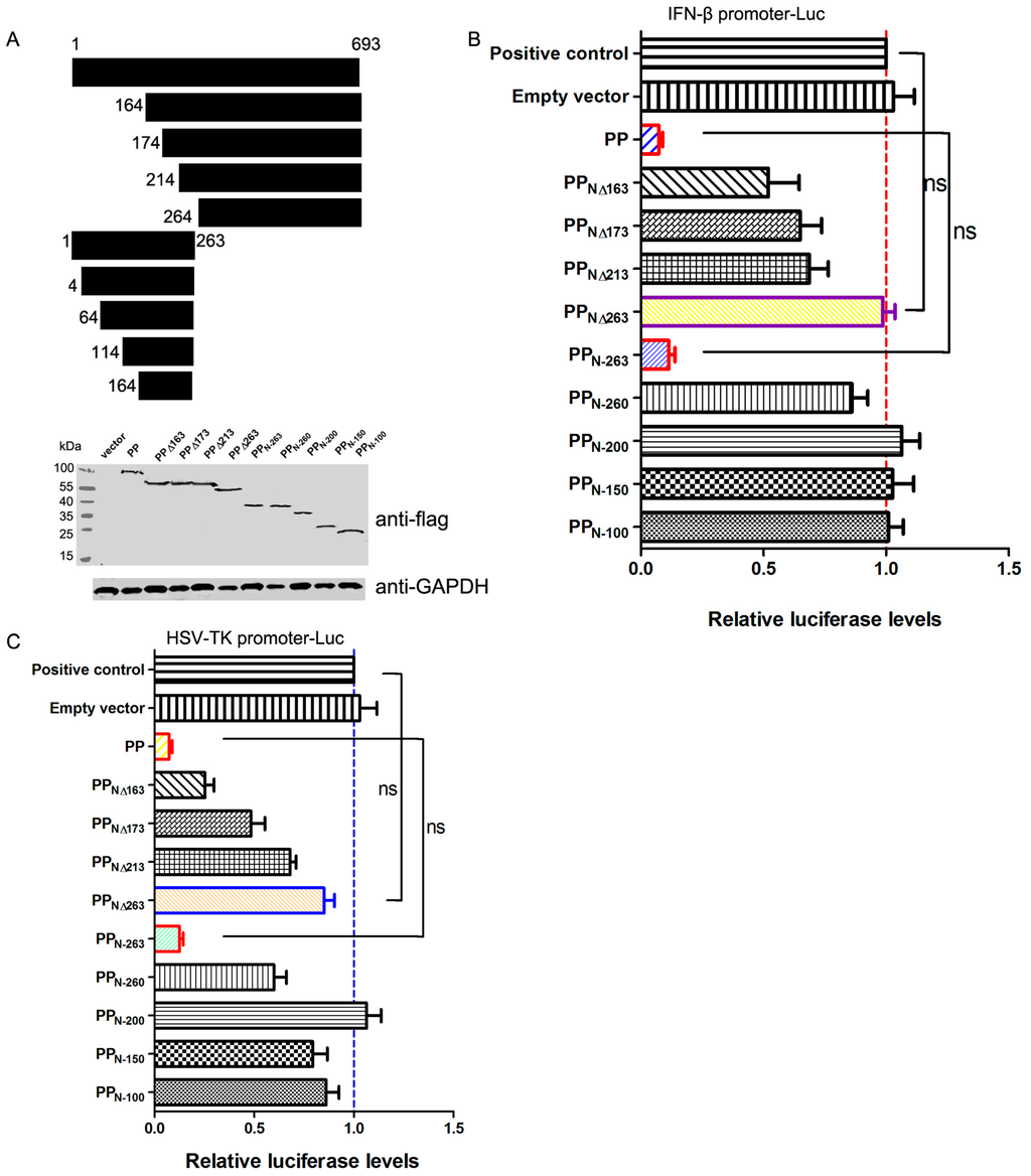 Screening the key domain of proteinase-polymerase (PP) required for the suppression of host gene expression. (A) Schematic diagram of the truncated PP constructs and the expression of each truncated mutant evaluated by Western blot using anti-Flag antibody; (B,C) CRFK cells were transfected with 0.25 μg of pFlag-PP and each truncated construct or empty vector together with 0.25 μg of the pIFN+33-Luc (B) or pHSV-TK-Luc (C) plasmids; At 24 h post-transfection, SeV (100 HA units) was inoculated into the pIFN+33-Luc transfection groups, and the luciferase assay was performed at 10 h post-inoculation. For the pHSV-TK-Luc transfection groups, the luciferase assay was performed directly at 24 h post-transfection. The positive controls were only transfected with 0.25 μg of pIFN+33-Luc (B) or pHSV-TK-Luc (C) Three independent experiments were performed and produced consistent results. The data represented the result of one experiment and were presented as means ± SD. ns, non-significant.