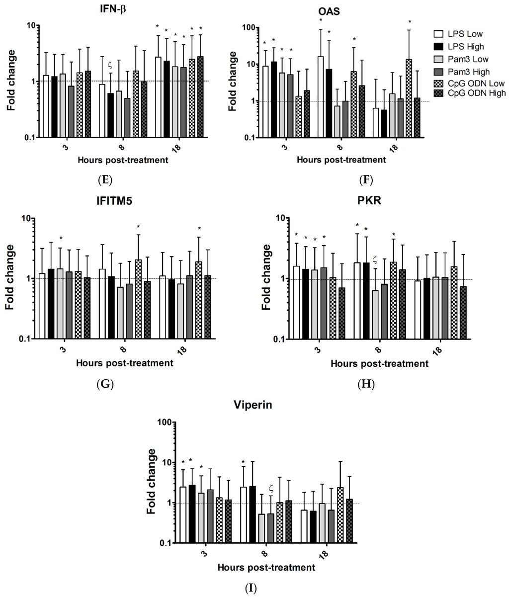 Relative expression of candidate genes interleukin 1 beta (IL-1β) (A); inducible nitric oxide synthase (iNOS) (B); interfon (IFN) regulatory factor 7 (IRF7) (C); IFN-α (D); IFN-β (E); oligoadenylate synthetase (OAS) (F); IFN induced transmembrane protein 5 (IFITM5) (G); protein kinase R (PKR) (H); Viperin (I), in the chicken trachea. Tracheal organ cultures (TOCs) were treated with two different concentrations of lipopolysaccharide (LPS) from Escherichia coli (E. coli) O26:B6 (1.0 µg/mL (LPS low) and 10 µg/mL (LPS high)), Pam3CSK4 (1.0 µg/mL (Pam3 low) and 10 µg/mL (Pam3 high)), CpG ODN 1826 (1.0 µg/mL (CpG ODN low) and 10 µg/mL (CpG ODN high)). Control groups received either non CpG ODN (10 µg/mL) or medium. Gene expression was assessed at 3, 8 and 18 h post-treatment using quantitative real-time (RT)-PCR, relative to the housekeeping gene β-actin. Gene expression is presented as fold change relative to the medium group in LPS and Pam3CSK4 (low and high doses) groups. Gene expression is presented as fold change relative to the non CpG ODN group in CpG (low and high doses) groups. Error bars represent standard errors of the means. Fold changes and standard errors were calculated using REST software. Significant up-regulation (p ≤ 0.05) is indicated by *. Significant down-regulation is indicated by ζ. There were six biological replicates in each group.