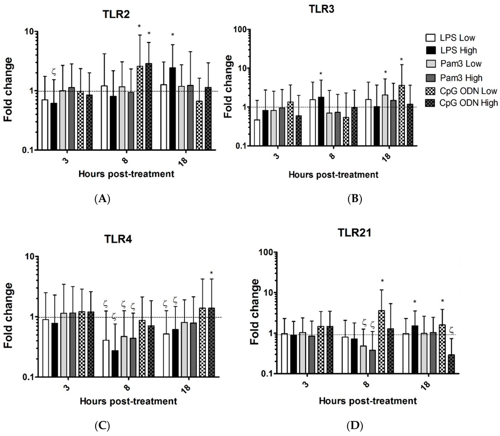 Relative expression of Toll-like receptor (TLR) 2 (A), 3 (B), 4 (C) and 21 (D) in the trachea. TOCs were treated with two concentrations of LPS from E. coli O26:B6 (1.0 µg/mL (LPS low) and 10 µg/mL (LPS high)), Pam3CSK4 (1.0 µg/mL (Pam3 low) and 10 µg/mL (Pam3 high)), CpG ODN 1826 (1.0 µg/mL (CpG ODN low) and 10 µg/mL (CpG ODN high)). Control groups received either non CpG ODN (10 µg/mL) or medium. Gene expression was assessed at 3, 8 and 18 h post-treatment using quantitative RT-PCR, relative to the housekeeping gene β-actin. Gene expression is presented as fold change relative to the medium group in LPS and Pam3CSK4 (low and high doses) groups. Gene expression is presented as fold change relative to the non CpG ODN group in CpG (low and high doses) groups. Error bars represent standard errors of the means. Fold changes and standard errors were calculated using REST software. Significant up-regulation (p ≤ 0.05) is indicated by *. Significant down-regulation is indicated by ζ. There were six biological replicates in each group.