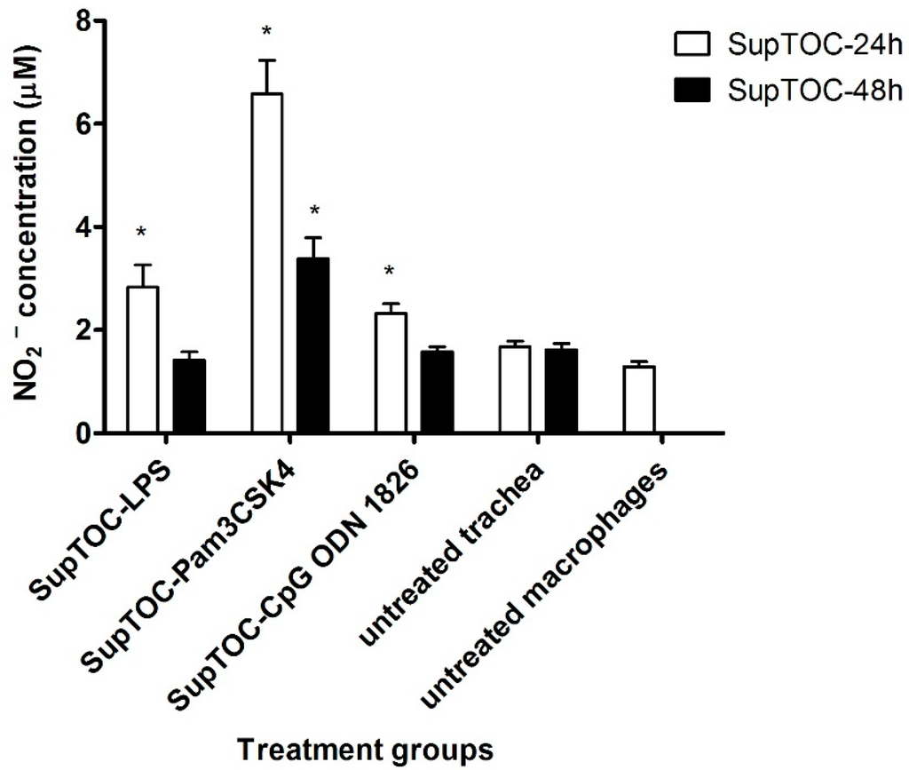 To determine whether culture supernatants of treated tracheal rings were able to activate chicken macrophages, MQ-NCSU cells were treated for 48 h with culture supernatants from treated tracheal rings. Culture supernatants of tracheal rings collected 24 h post-treatment with LPS (SupTOC-LPS-24h), SupTOC-PamCSK4-24 and SupTOC-CpG-24h significantly induced nitrite production by MQ-NCSU cells. In addition, SupTOC-PamCSK4-48 significantly induced nitrite production by chicken macrophages compared to untreated chicken macrophages, however, SupTOC-LPS-48h, and SupTOC-CpG-48h did not induce nitrite production by these cells (Figure 3).