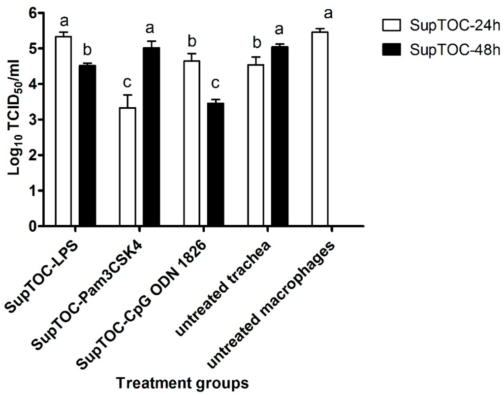 Supernatants from TOCs stimulated with TLR ligands reduced influenza virus replication in chicken macrophage cells. There were five groups. Three of them were treated with supernatants from TOCs treated with LPS from E. coli O26:B6, Pam3CSK4 and CpG ODN 1826 and one was treated with supernatant from TOCs that received only medium (untreated trachea), and the last group did not receive supernatant from TOCs. Cells were infected 6 h later with H4N6 avian influenza virus (MOI of 1.0). Virus titer (12 h after infection) was quantified by means of a TCID50 assay. a–c columns with no common letter are significantly different (p ≤ 0.05). SupTOC-24h: culture supernatants from TOCs collected 24 h post-treatment with TLR ligands or medium. SupTOC-48h: culture supernatants from TOCs collected 48 h post-treatment with TLR ligands or medium.