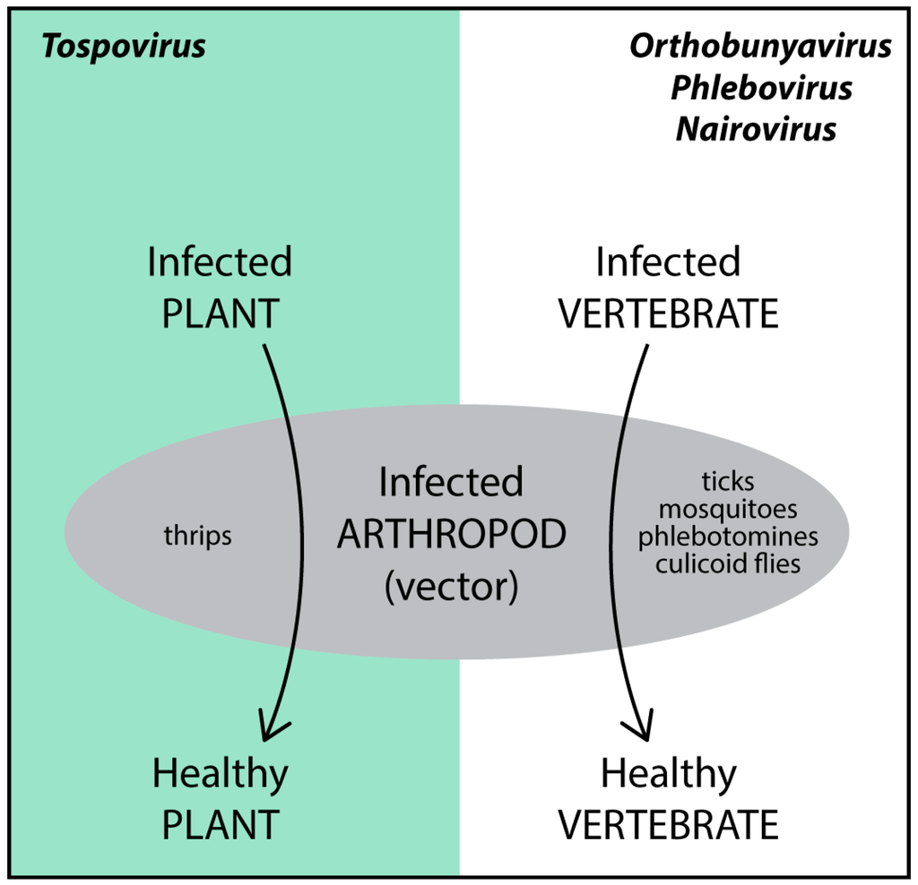 The Bunyaviridae, with more than 350 identified species, is divided in five genera and contains several important viruses that cause major problems in human/animal health and agriculture production systems. All five genera of this family contain viruses pathogenic to either animals/humans (Orthobunyavirus, Phlebovirus, Nairovirus and Hantavirus) or plants (Tospovirus). Most bunyaviruses are arthropod-borne viruses (arboviruses), as they replicate in the arthropods by which they are transmitted (Figure 1). Hantaviruses present an exception, as they are rodent-borne and no arthropod vector has been identified so far.