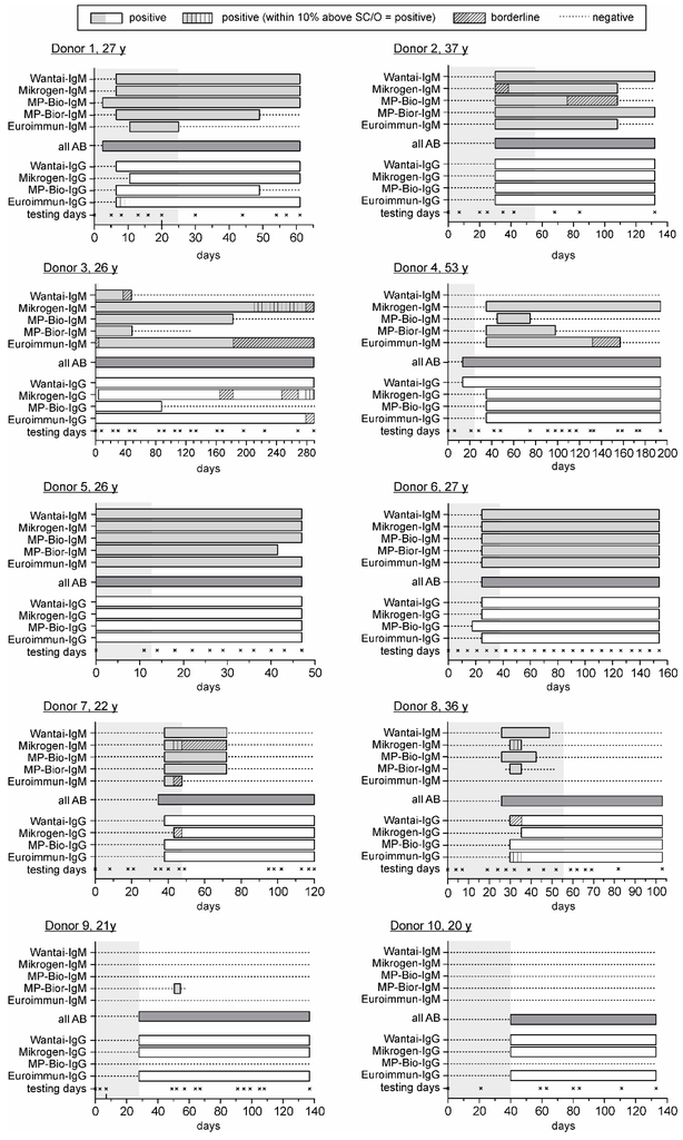 Consideration of seroconversion panels from donors 1 and 3 suggests that IgG antibodies seem to disappear using the MP-Bio (donor 1) or the Mikrogen, MP-Bio or Euroimmun assays (donor 3).