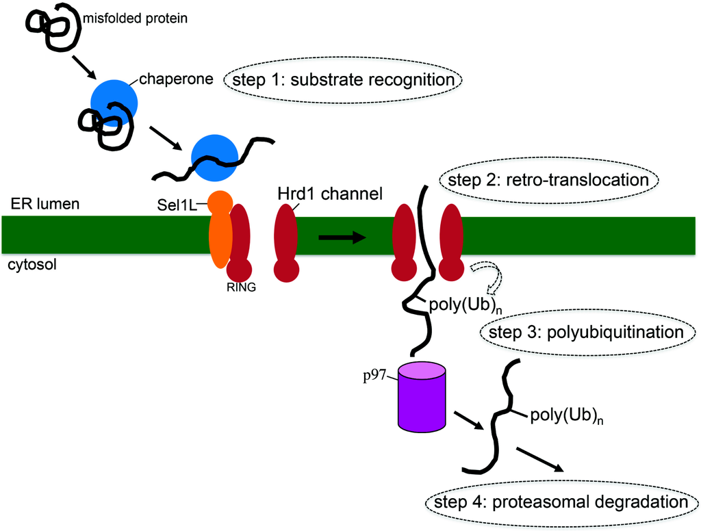 - Stein, A.; Ruggiano, A.; Carvalho, P.; Rapoport, T.A. Key steps in ERAD of luminal ER proteins reconstituted with purified components. Cell 2014, 158, 1375–1388. [Google Scholar] [CrossRef] [PubMed]