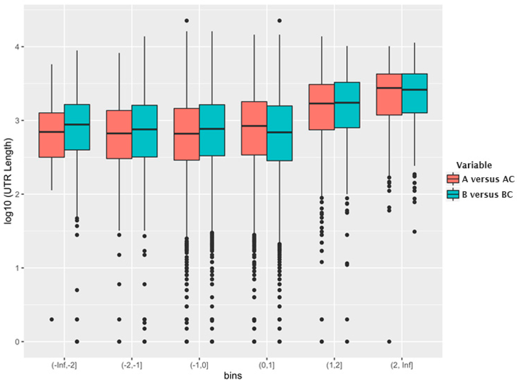 Relationship between bins of similar log2 (fold change) on the x-axis and the log10 (UTR length) on the y-axis. A, mRNAs encapsidated in HIV-1 virus-like particles (VLPs); AC, mRNAs in cells producing HIV-1 VLPs; B, mRNAs encapsidated in murine leukemia virus (MLV) VLPs; BC, mRNAs in cells producing MLV VLPs.