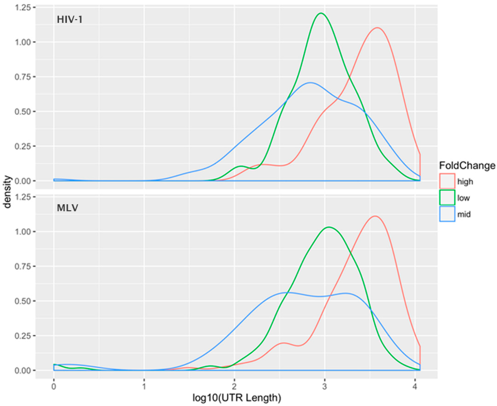 The data was also analyzed by selecting the 1000 mRNAs with the highest fold change, the 1000 species with the average fold-change, and the 1000 species with the lowest fold-change, i.e., those with the most preferential, average, and most excluded encapsidation efficiencies. Figure 3 shows the “density plot” (frequency distribution) of the 3′-UTR lengths for these three subsets of the mRNAs (for both HIV-1 and MLV). This analysis shows that the preferentially packaged mRNAs have unusually long 3′-UTRs, while there is little difference in the mean 3′-UTR lengths between the other two classes. A t-test between the UTR lengths in the “average fold-change” group and the “high fold-change” group was highly significant, with a p-value < 10−15. This relationship was observed for both HIV-1 and MLV Gag, suggesting that this apparent selectivity for long 3′-UTR RNAs is a general property of the retroviral assembly pathway, not unique to HIV-1 (a member of the lentivirus genus) or MLV (a gammaretrovirus). One possible explanation is that the 3′-UTR is a stretch of mRNA that is unoccupied by ribosomes; perhaps this provides sites to which Gag can bind in the absence of gRNA. Thus, RNAs with longer 3′-UTRs have a larger number of available Gag binding sites than RNAs with shorter 3′-UTRS. It is interesting to notice that the gRNA of retroviruses has an extremely long 3′-UTR.