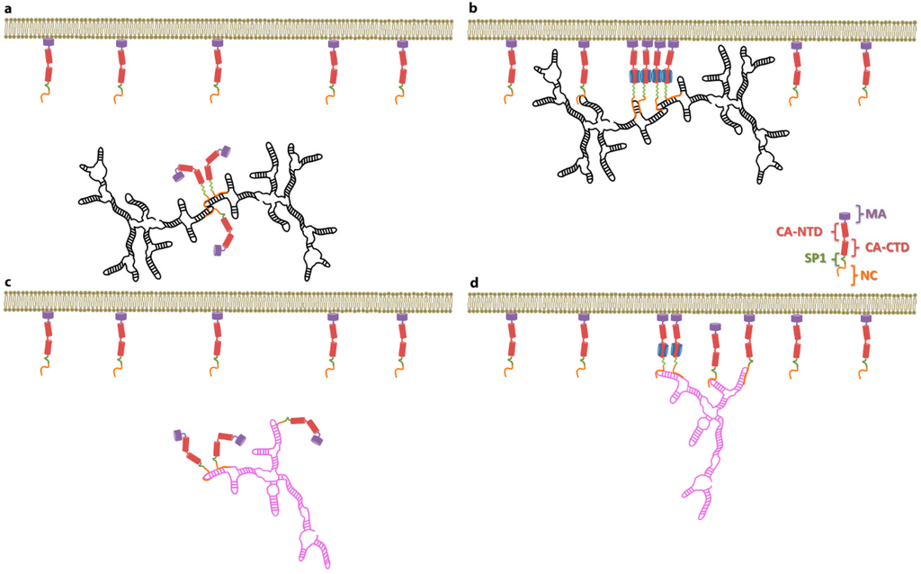 Schematic representation of the binding of HIV-1 Gag to the dimeric HIV-1 genomic RNA (gRNA) (a,b) and to non-Ψ RNA (c,d). (a) In the cytoplasm Gag binds to the HIV-1 gRNA by recognizing the RNA dimeric interface. Binding of Gag to Ψ increases the local concentration of Gag, thus promoting a conformational change in the SP1 domain from a random coil to an α-helix (green portion of Gag); (b) Once the HIV-1 Gag–dimeric gRNA complexes are bound to the plasma membrane, the specific Gag–RNA interactions promote a conformational change in Gag that enables high-order Gag–Gag interactions (blue interface); (c) In the absence of the HIV-1 gRNA Gag binds to mRNAs; however, because these interactions are non-specific, a higher Gag concentration is required to induce the conformational change in Gag; (d) When Gag–non-Ψ RNA complexes are bound to the plasma membrane, the local concentration of Gag is high enough to promote high-order Gag–Gag interactions. MA: matrix; CA-NTD: N-terminal domain of the capsid; CA-CTD: C-terminal domain of the capsid; SP1: spacer 1; NC: nucleocapsid.
