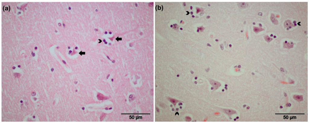 Histopathology of cerebral cortex (Grevy’s zebra, CG3) showing degenerated neurons (arrows) (a) with mild glial reactions (head of arrows) in (a,b); HE staining.