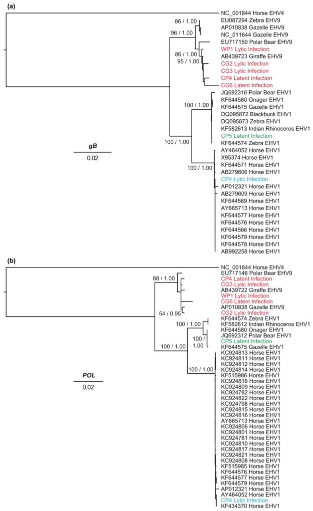 Phylogenetic trees inferred using maximum likelihood from nucleotide sequences of (a) gB and (b) Pol genes for the six zebras WP1, CG2, CG3 (Equine herpesvirus 9 (EHV-9) lytic infection), CP4 (Equine herpesvirus 1 (EHV-1) lytic and EHV-9 latent infection), CP5, and CG6 (EHV-1 and EHV-9 latent infection, respectively) and other equine herpesviruses. Reference sequences are indicated by GenBank accession number, species from which the sequence was isolated, and viral strain. The novel EHV-9 sequences are in red, the novel EHV-1-horse like zebra sequence is in blue, and the novel zebra-EHV-1 sequence is in green. The trees are shown with branches lengths scaled to nucleotide substitutions per site. Selected nodes are labeled with maximum-likelihood bootstrap support values and posterior probabilities, separated by a slash “/”.