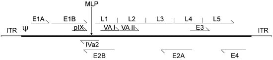 Although there are roughly 50 distinct serotypes of human Adenoviridae, Ad serotypes 2 and 5, both of subclass C, are the most well-studied []. The genomes of Ad2 and Ad5 are ~95% identical at the nucleotide level and, for the purpose of this review, will be considered experimentally identical. Adenoviruses are icosahedral, non-enveloped, double stranded DNA viruses of approximately 70–100 nm in diameter for the main “body” of the virus, with varying lengths of the viral attachment protein, fiber, protruding from the vertices of the icosahedron []. Adenoviruses display a naturally diverse tropism for tissue types, which varies between viral subtypes, however, in nature, Ad5 most often infects cells of the upper respiratory tract []. The Ad5 genome is roughly 36 kb and is transcribed in essentially two stages upon entry into the host cell (Figure 1) []. Soon after the Ad genome reaches the nucleus, the Ad early genes are expressed, including early region 1 (E1), E3 and E4, which function to activate other transcription units on the Ad genome as well as modulate the host cell cycle and immune responses []. The E2 region encodes proteins directly involved in Ad DNA replication, such as the virally-encoded DNA polymerase. Only after the onset of DNA replication is the major late promoter (MLP) activated, which results in the production of a large (roughly 26 kb) transcript which subsequently is processed through alternative splicing to produce the late transcripts late region 1 (L1) to L5 []. These late regions encode the structural components necessary for Ad assembly, including the Ad capsid proteins []. There are also four small products produced at intermediate/late times of infection, including the structural protein IX (pIX), and the IVa2 protein that helps package viral DNA into immature virions []. The other intermediate/late products, viral associated (VA) RNA I and II, inhibit activation of the interferon response, impede cellular micro-RNA processing, and may influence expression of host genes [,]. The viral DNA also contains the origins of replication, the inverted terminal repeats (ITR), which comprise ~100 bp at each end of the genome and the packaging sequence, which is ~150 bp in length and is located immediately adjacent to the left ITR [].