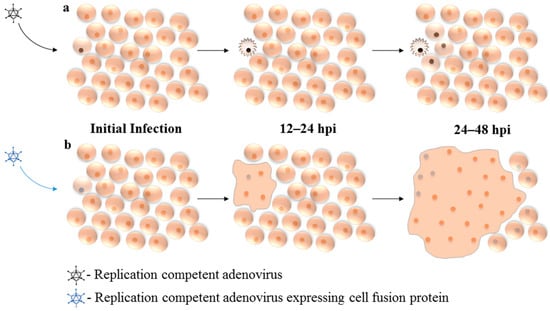 Mechanism of enhanced viral spread through expression of fusogenic protein: (a) Upon infection, replication-competent oncolytic adenovirus (Ad) must undergo productive replication and significantly damage the host cell in order to affect neighboring cells. (b) Cell-fusion proteins allow Ad to spread through densely packed cells with much greater efficiency, before replication-associated cell death or progeny release. Initial Infection: Virus enters host cell and initiates gene expression and early phase of replication. 12–24 hpi: Viral protein expression and progeny production. 24–48 hpi: Viral progeny released from initially infected cell, enter nearby cells. hpi: hours post-infection.
