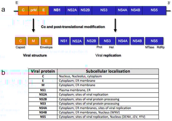 Representation of Flavivirus genome organisation. (a) Ten viral genes encode for three structural and seven non-structural (NS) viral proteins that are co- and post-translationally modified into mature viral proteins by host factors and the viral NS2B-3 protease complex [2]; (b) Viral protein subcellular localisation is generally cytoplasmic or associated with the endoplasmic reticulum (ER) membrane, due to the localisation of replication, but in specific viruses (listed), proteins such as NS5 can also localise to the nucleus.