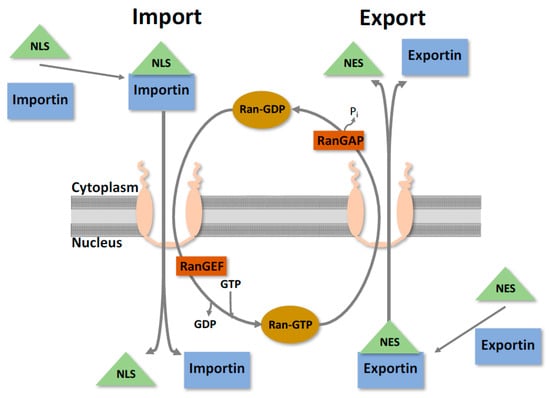 As mentioned, specific molecules are required for nucleocytoplasmic transport to occur, typically by a member of the large superfamily of proteins known as karyopherins (also known as importins, exportins and transportins) [15,16]. Karyopherins mediate transport by binding to an NLS/NES and interact directly with components of the NPC. To further regulate this process, karyopherins can bind to members of the Ras-like GTPase Ran [17]. This helps provide the directionality of nuclear transport by creating a Ran gradient across the NPC. In the cytoplasm, Ran is in a GDP bound state, whilst in the nucleus it is bound to GTP. This is determined by the Ran GTPase activating protein (RanGAP) in the cytoplasm and the Ran guanine nucleotide exchange factor (RanGEF) in the nucleus [17]. In the cytoplasm, a karyopherin binds to its associated NLS/Cargo and forms a protein-complex to facilitate transport to the NPC. As it traverses, it interacts with the RanGTP in the nucleus, releasing the protein and is recycled back into the cytoplasm. Export occurs in an analogous way, with RanGTP affinity being essential within the nucleus, losing binding as it travels through the NPC towards the cytoplasm (as shown in Figure 2).