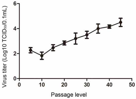 The viral titer of the PEDV strain NJ propagated in IECs was determined at 5-passage intervals. The viral titer of the IEC-adapted PEDV strain NJ reached 104.5 TCID50/0.1 mL at passage 45 (Figure 2), suggesting that the use of an IEC culture is a promising approach for propagating PEDV.