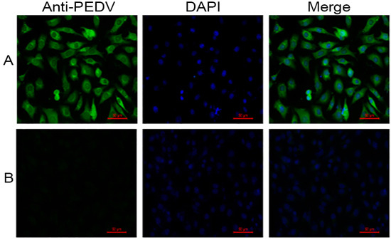 Detection of PEDV strain NJ in IECs by immunofluorescence assay at 24 h post-infection; mouse anti-PEDV S protein monoclonal antibody and fluorescein isothiocyanate (FITC)-conjugated goat anti-mouse immunoglobulin G (IgG) were respectively used as primary and secondary antibodies, followed by counterstaining with 4,6-diamidino-2-phenylindole (DAPI). (A) PEDV strain NJ-infected IECs; (B) Non-infected IECs.