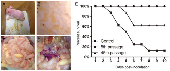 To compare the pathogenicity of the lower-generation NJ with that of the higher-generation NJ, 5 mL of the IEC-adapted NJ culture at the 5th and 45th passage (104.5 TCID50/mL) and volume-matched virus-free cell culture medium were administrated orally to the piglets. The clinical signs and survival percentage of the piglets was monitored daily over a 10-day observation period. All piglets infected with 5th passage cultures and three (3/8) piglets infected with 45th passage cultures showed diarrheic feces, significantly emaciated body condition, and experienced severe watery diarrhea with vomiting. Abundant yellow, watery, and foul-smelling stools were also observed around the perianal region of the piglets infected with 45th passage virus (Figure 6A,B). The remaining five (5/8) piglets infected with 45th passage showed signs of mild diarrhea after inoculation that seemed to be transient. However, in the control group, the piglets were healthy without watery diarrhea (data not shown). As shown in Figure 6E, one piglet death occurred within 3 days and in total seven piglets died after the 10-day challenge in the group that received the 5th passage. However, only three piglets died in the group that received the 45th passage; although the remaining piglets had the significant clinical signs of PED, they survived the 10-day challenge. The small intestines of one of the dead piglets infected with 45th passage IEC-adapted NJ developed severe clinical symptoms, the same as those in the piglets infected with the 5th passage virus. The small intestines were typically distended with accumulation of yellow fluid and mesenteric congestion, and the small intestinal wall was thin and transparent (Figure 6C,D). The diarrheal feces and intestinal tissues collected from these piglets were analyzed by RT-PCR targeting the M gene, and the PCR products were found to be consistent with the expected result. Moreover, immunofluorescence analysis of the small intestine tissue revealed that the viral antigen was predominantly present in the small intestines (data not shown).