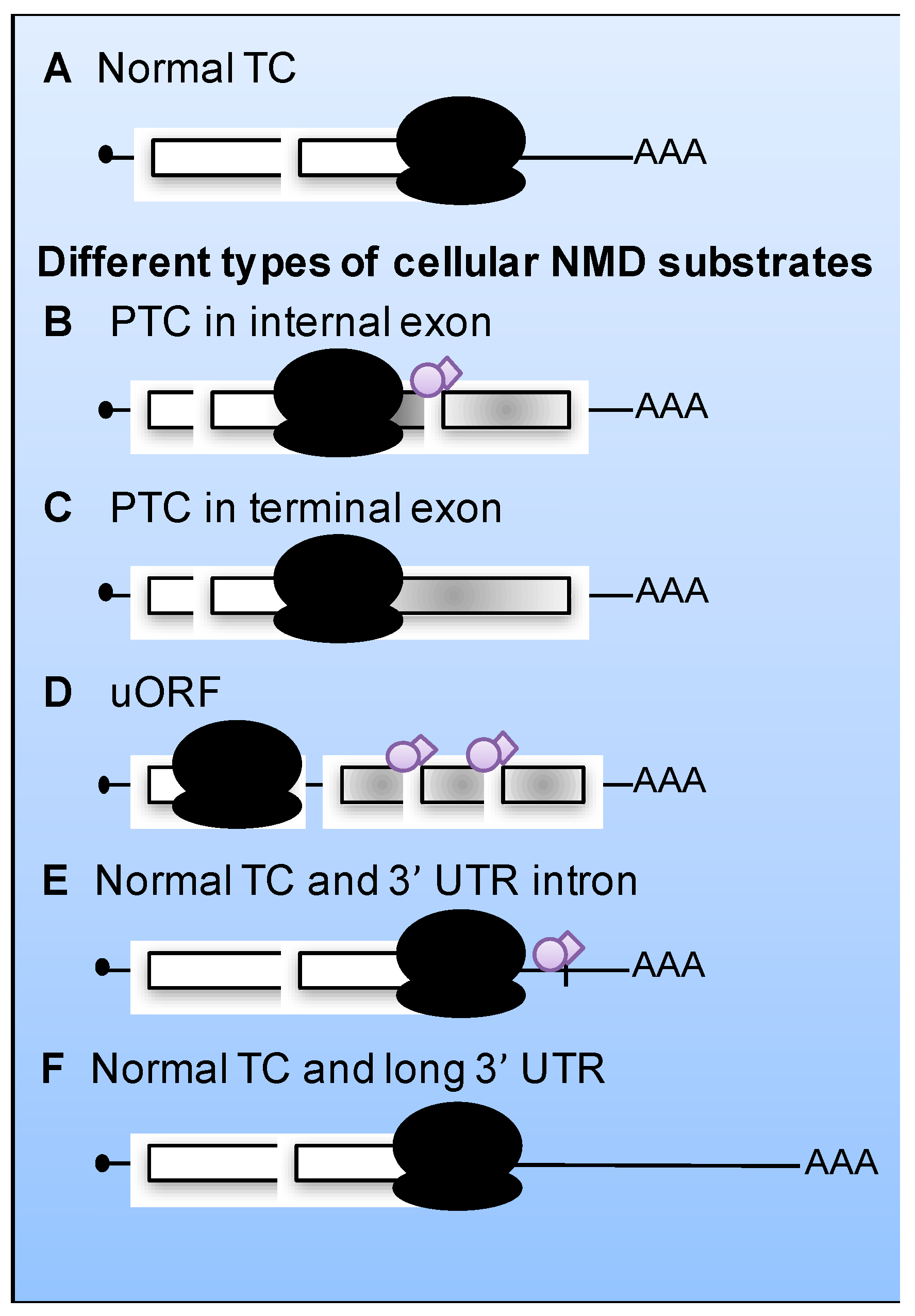 Different types of cellular mRNAs that can be substrates for nonsense-mediated mRNA decay (NMD). (A) An mRNA with a normal termination codon (TC) positioned in a context that does not trigger NMD: the termination codon is at the end of the last exon followed by a short 3’‑untranslated region (3’-UTR). (B–F) NMD targets comprise mRNAs with a truncated ORF due to a premature termination codon (PTC) in an internal (B) or terminal (C) exon. The presence of protein complexes known as exon junction complexes (EJCs) downstream the TC increases, but it is not necessary for, NMD (see Section 3). Upstream ORF (uORF), (D), the presence of EJC-associated introns in the 3’-UTR (E), and long 3’-UTR (F), all act as RNA destabilizing factors and trigger NMD. White boxes denote translated ORFs; gray boxes denote the fraction of the ORF that is not translated due to the presence of a PTC. Ribosomes are indicated in black, EJC in purple.