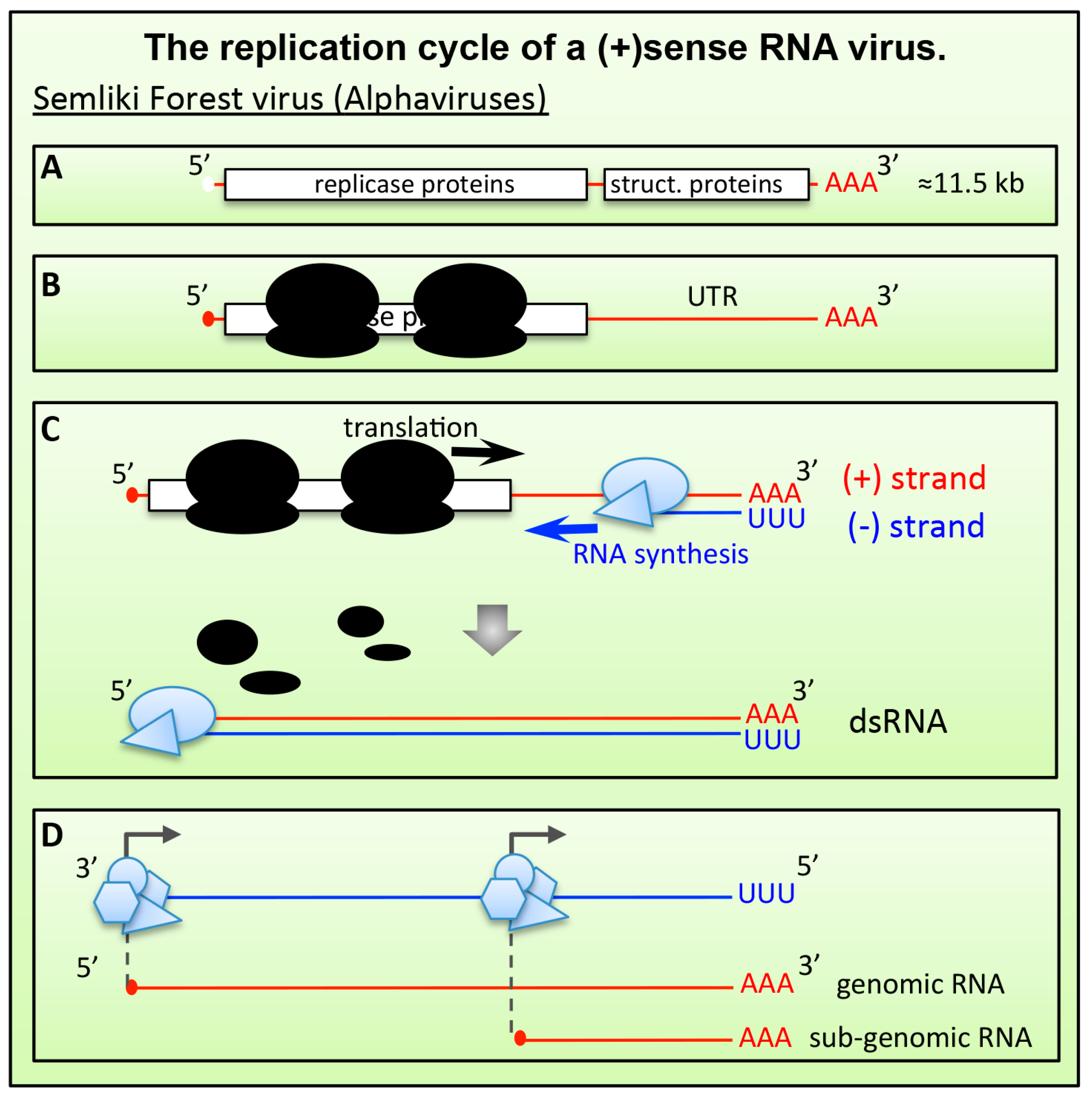 The replication cycle of a positive-stranded RNA ((+)RNA virus). (A) The bi-cystronic mRNA genome of Alphaviruses is capped a poly-adenylated. The first ORF encodes the replicase proteins; the second ORF encodes the structural genes (capsid and envelope proteins). (B) After virus entry, the genome is delivered into the cytoplasm where the first ORF is translated, leaving a ≈4000 nucleotides long 3’-UTR. (C) Newly synthesized viral replicase polyproteins assemble at the 3’-end of the genome and produce a complementary “minus” sense copy. Translation of the viral genome must be shut down. (D) After auto-proteolytic cleavage, the replicase complex switches the template and uses the “minus” strand to synthetize new copies of full-length genome and a shorter sub-genomic mRNA that encodes the structural proteins (the second ORF).