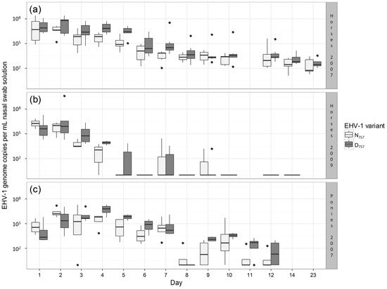Boxplots illustrating the differences in amounts of nasal virus shedding between equine herpesvirus type 1 (EHV-1) variants (N/D752) across all days and animals for each experiment. (a) Experiment on 14 horses (seven infected with the N752 and seven infected with the D752 variant) conducted by Goodman et al. [4]; (b) Experiment on nine horses (three infected with the N752 and six infected with the D752 variant) conducted by Van de Walle et al. [5]; (c) Experiment on eight ponies (four infected with the N752 and four infected with the D752 variant) conducted by Goodman et al. [4]. If sampling took place on a given day, then all infected animals were sampled, with the exception of day 23 in the experiment on horses conducted by Goodman et al. where samples were restricted to six individuals infected with the N752 variant and four individuals infected with the D752 variant. In each boxplot, the bottom and top of the box indicate the first and third quartiles, and the band inside the box indicates the median. Upper (and lower) whiskers extend to the highest (and lowest) value that is within 1.5 times the inter-quartile range (i.e., the distance between the first and third quartiles). Data points beyond the end of the whiskers are plotted as dots [10]. Due to highly skewed distributions, the amount of nasal virus shedding was plotted on a logarithmic scale.