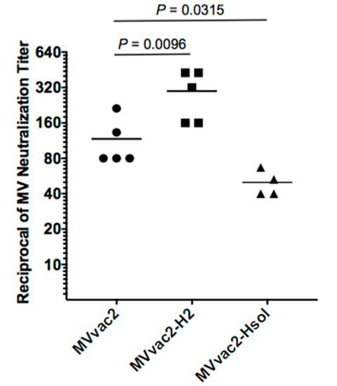 Previously, a modified MV with increased expression and incorporation of the full-length H protein, termed MVvac2-H2, proved significantly more immunogenic than the parental vaccine MVvac2 in mature (six- to eight-week-old) outbred, non-susceptible CD1 mice and in mature genetically modified MV-susceptible HuCD46Ge-IFNarKO mice, which express the human CD46 receptor for MV vaccine strains with human-like distribution in a type I interferon knockout background. In both murine hosts, MVvac2-H2 elicited approximately 2.5-fold higher neutralization titers than MVvac2 elicited [15].