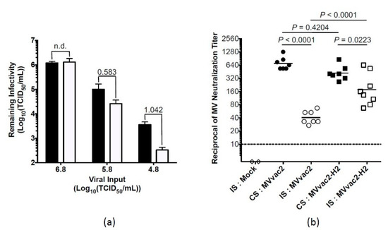 Immunogenicity of MV expressing additional H in the presence of artificially acquired anti-measles antibodies at levels capable of reducing viral titer ex vivo: (a) artificially introduced MV-immune serum reduces MVvac2 infectivity ex vivo. Five-week-old MV-susceptible mice were inoculated with equivalent amounts of diluted irrelevant control (black bars) or MV-hyperimmune serum (white bars). Pooled sera obtained from these animals the day after passive transfer was assayed for its impact on MV infectivity after incubation with varying titers of MVvac2. Remaining viral titers following incubation are reported, with bars indicating the standard deviation of three experiments. The logarithmic difference in MV infectivity is numerically annotated above each bar pair, with n.d. indicating no difference; (b) anti-MV neutralizing immunity in the presence of artificially introduced neutralizing antibodies. One day after the artificial passive transfer of control serum (CS, black symbols) or immune serum (IS, white symbols), mice from (a) were vaccinated with 105 TCID50 MVvac2 (circles) or MVvac2-H2 (squares), or mock vaccine (diamonds). Mice were bled 28 days post-vaccination, and anti-MV neutralizing titer was determined. Each symbol represents one animal. Solid horizontal lines represent group geometric mean. The interrupted horizontal line indicates the limit of detection. Statistical significance of differences in neutralizing immunity was assessed by two-way ANOVA on log2-transformed reciprocal titers, followed by Sidak’s multiple comparisons test.