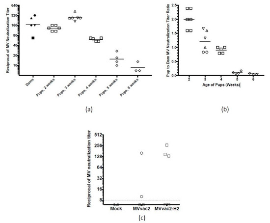 Natural passive transfer of anti-measles maternal immunity and vaccine immunogenicity in its presence: (a) time course of passive transfer of anti-MV maternal antibodies in MV-susceptible mice. Five MV-susceptible dams were vaccinated against MV and mated. Their pups were euthanized at the indicated age and serum collected to determine anti-measles status, expressed here as the raw reciprocal titers. Pups (white symbols) from the same litter share the same symbol shape, which they also share with their dam (black symbols), with each symbol representing one animal. Horizontal lines indicate group mean; (b) reciprocal titers from (a) are also expressed as ratios of pup to dam neutralizing titers; (c) parental and modified measles vaccine immunogenicity in the presence of maternally acquired anti-measles antibodies. Four-week-old littermates of a MV-immune dam were vaccinated with 105 TCID50 of the indicated virus or mock, and anti-MV neutralizing immunity was assessed three weeks later. Each symbol represents one animal and the interrupted horizontal line indicates the limit of detection.