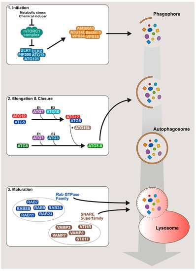 In mammalian cells, canonical autophagy is regulated by approximately 30 autophagy-related proteins (ATG) and several non-ATG proteins, which coordinate the formation of intracellular vesicles, sequestering portions of cytoplasmic material in a three-step process: initiation, elongation and maturation (Figure 1). The initiation step starts with the isolation of a cellular membrane (called phagophore) at the endoplasmic reticulum (ER) surface by the formation of an omega-like shape protrusion [,,]. This structure is induced by a preinitiation complex composed of UNC-51-like kinase (ULK) 1 and ULK2 proteins, a focal adhesion kinase family-interacting protein of 200 kDa (FIP200), and ATG101 and ATG13 proteins [,,,,]. In the absence of stimuli, the preinitiation complex is inhibited by a key regulator of the autophagy machinery, the serine/threonine kinase mammalian target of rapamycin (mTOR) protein. mTOR, in complex with different cellular cofactors to form mTOR complex 1 (mTORC1), maintains the preinitiation complex in an inactivated state by phosphorylating ULK1 and ATG13 [,,]. After stimulation by metabolic stress (e.g., starvation, oxidative stress or hypoxia) or chemical autophagy inducers such as rapamycin [], mTORC1 is inhibited, allowing the release and the translocation of the preinitiation complex to the site of phagophore formation [,]. Subsequently, ULK1 activates the class III phosphatidylinositol 3-kinase (PI3K) complex formed by the PI3K vacuolar protein sorting 34 (VPS34), VPS15 (also called p150), Beclin 1/ATG6, ATG14L and the activating molecule in Beclin 1-related autophagy 1 (AMBRA1) protein. The activated PI3K complex is targeted to the ER-mitochondria contact sites, where it produces phosphatidylinositol-3-phosphate (PI(3)P), triggering phagophore formation [,,,]. The elongation step, corresponding to phagophore expansion, is regulated by the ATG5-ATG12 conjugate and lipidated forms of ATG8 family members [,,,]. Production of these components requires two ATG7-dependent ubiquitin-like conjugation systems. Indeed, the E1-like enzyme ATG7, in association with E2-like enzymes ATG10 or ATG3, promotes the formation of ATG5–ATG12 conjugate [,,] or the lipidation of ATG8s with phosphatidylethanolamine (mostly designated ATG8-II or LC3-II) [,], respectively. ATG8 members, comprising LC3-like (LC3A, LC3B and LC3C) and GABARAP-like (GABARAP, GABARAPL1 and GABARAPL2) subfamilies, are key markers used to monitor the autophagy process []. At the steady state, ATG8 proteins exist as free cytosolic forms, usually referred to as ATG8-I or LC3-I. Once autophagy is induced, ATG8 proteins are translocated to the nascent phagophore, where the lipidation reaction tightly binds ATG8s to the membrane. The ATG5-ATG12 conjugate, in interaction with ATG16L, controls ATG8s lipidation by specifying the membrane localization where the reaction takes place []. ATG8 proteins drive membrane expansion [] and phagophore closure []. The resulting double-layered membrane vesicle is called autophagosome. The maturation step corresponds to the fusion of autophagosomes with lysosomes to generate autolysosomes, where the autophagosomal content is degraded. This step is regulated by cellular machineries involved in vesicle transport and fusion. In particular, several studies have shown that members of the Rab GTPase family (RAB7, RAB8B, RAB9, RAB11, RAB23 or RAB24) [,,,,] and the soluble N-ethylmaleimide attachment protein receptor (SNARE) superfamily (VAMP3, VAMP7,VAMP8, VTI1B or STX17) [,,,] are essential for the late stage of autophagy mechanism.