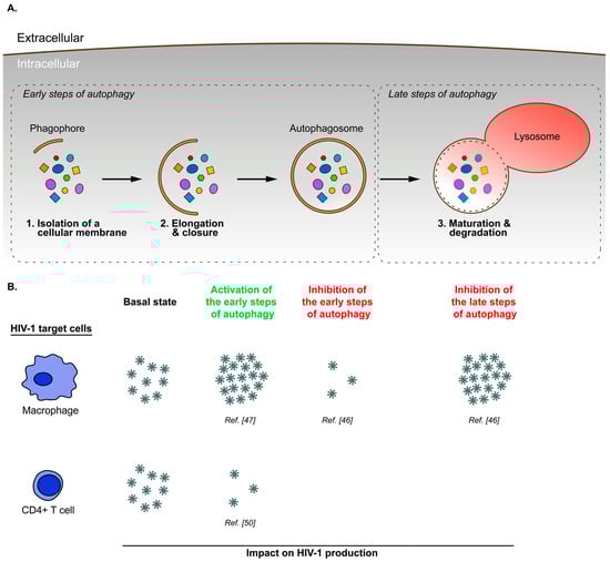 The interplay between autophagy and HIV-1 production in cell type specific manner. (A) Canonical autophagy mechanism can be decomposed into early steps, corresponding to the isolation, elongation and closure of a cellular membrane (phagophore) to form a double-layered membrane vesicle enclosing cytoplasmic materials (autophagosome); and late steps, corresponding to the autophagosome-lysosome fusion/maturation and the degradation of autophagosomal content; (B) In HIV-1 infected cells, activation or inhibition of early and late steps of autophagy process modulate virus production in a cell-type-specific manner. While induction of autophagy dramatically impairs HIV-1 production in CD4+ T cells, activation of early steps of autophagy is indispensable for the optimal production of viruses in macrophages. Conversely, blockage of late steps of autophagy favors an efficient HIV-1 production in macrophages.