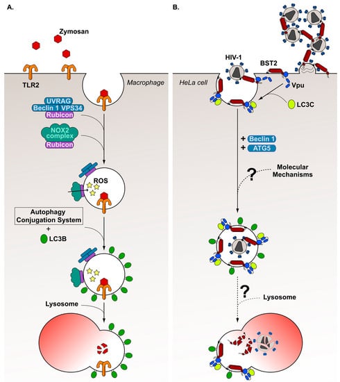 Several non-canonical autophagy mechanisms have been identified in the past decade []. Among these, the LC3-Associated Phagocytosis (LAP) process was highlighted in 2007 by Sanjuan et al. []. The authors observed that TLR2 stimulation with zymosan, a yeast cell wall glucan, results in the engulfment of the TLR2-zymosan complex in a phagosome decorated with LC3-II molecules in macrophages (Figure 3A). This process depends notably on ATG5 and ATG7 proteins. In addition, the authors noticed a rapid Beclin 1 association with phagosomes, and an increased PI3K complex activity preceding LC3 recruitment. However, contrary to canonical autophagy, it was shown that LAP does not require all autophagy machinery components, since this process is independent of the autophagy preinitiation complex [,]. In a major advance in 2015, Martinez et al. [] defined more precisely the molecular steps controlling the LAP mechanism, and identified the Rubicon protein as a LAP-specific marker. Thus, they revealed that, following zymosan internalization by phagocytosis, Rubicon is recruited at the delimiting membrane of the phagosome, resulting in local production of PI(3)P. Indeed, Rubicon interacts with a PI3K complex containing the UV radiation resistance-associated gene (UVRAG) protein, Beclin 1, VPS34, but not ATG14L or AMBRA1. Subsequently, PI(3)P mediates the recruitment of the NADPH oxidase-2 (NOX2) complex composed of NOX2 and the subunits p22PHOX, p40PHOX, p47PHOX and p67PHOX. This complex is stabilized at the phagosome membrane by a direct interaction between Rubicon and p22PHOX, inducing ROS production in the phagosome. ROS is demonstrated to be indispensable for LC3-II translocation at the phagosome membrane, although the precise mechanism has not been determined yet. The authors also demonstrated that components of the autophagy conjugation system (ATG5, ATG7, ATG12, ATG16L, ATG3 and ATG4B) are required for LC3-II recruitment. Finally, Martinez et al. [] noticed that, by associating with phagosomes, LC3-II assists fusion between these structures and lysosomes, enhancing the maturation process.