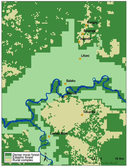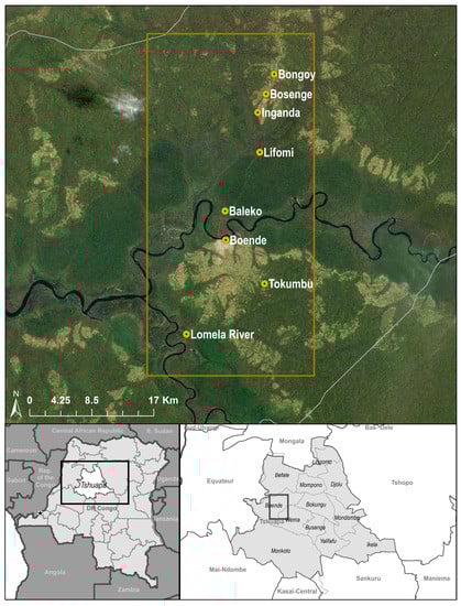 The Boende Health Zone is one of 12 health zones within Tshuapa Province, DRC (Figure 1). It has an area of 10,275 km2 and an estimated population of 249,588 people (2014 Tshuapa demographic data), with a population density of 24 persons per km2. The vegetation of this health zone is typical of the lowland Congo Basin rainforest. A total of eight localities (Baleko, Boende, Bongoy, Bosenge, Inganda, Lifomi, Lomela, and Tokumbu) within 25 km of the town of Boende were sampled. All sample collection sessions were conducted between May and July of 2012, 2013, and 2015. These sites included seasonally flooded primary forest, secondary forest, agricultural areas, and villages. There are two dry seasons, one from January to early March, and another from June to early September; the remaining time periods are rainy seasons. The area receives an average of 210.9 cm of rain per year and daily temperatures average between 24 °C and 30 °C year-round (data provided by Ministry of Health, Province of Tshuapa, DRC).