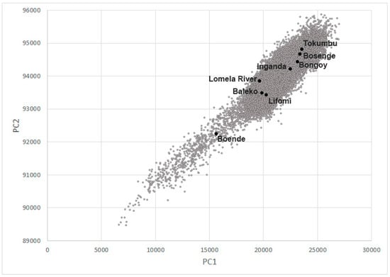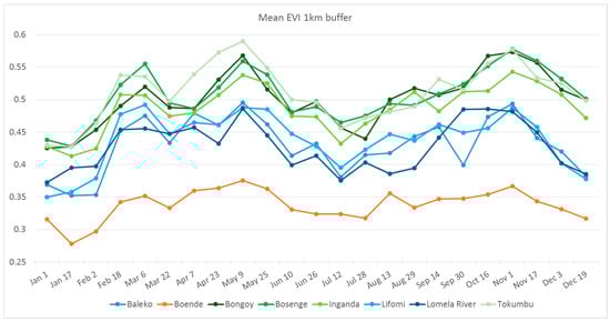 The mean EVI values calculated within the 1 km buffers for Bongoy, Bosenge, Inganda, and Tokumbo are consistently higher than the other localities throughout the year (Figure 4); Baleko, Lifomi, and Lomela River have lower EVI values than localities mentioned above, but higher than those presented by Boende. These differences are also shown when principal component values are plotted (Figure 5), where the four localities with higher EVI values are grouped on the top right part of the plot, the three localities with intermediate EVI values are in the middle of the plot and the dot corresponding to Boende is towards the lower left part of the plot.