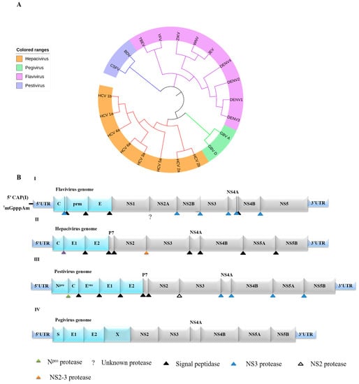 Flaviviridae phylogenetic characteristics and basic features of Flaviviridae reference genomes. (A) Flaviviridae family tree. Viruses related to this review and other representative Flaviviridae viruses; (B) The viral genome is shown in a schematic representation with a single long ORF (open reading frame) encoding the polyprotein, which is flanked by a 5′-terminal non-coding region (NCR) and a 3′-terminal NCR. The amino terminus of the genome encodes 3~5 structural proteins that form the virus particle and 7 non-structural (NS) proteins. Light blue and grey bars represent the structural and NS proteins, respectively. Cleavage sites for signal peptidase (black triangle), NS3 protease (blue triangle), unknown protease (?), NS2 protease (white triangle), Npro protease (green triangle), and NS2-3 protease (yellow triangle) are indicated.