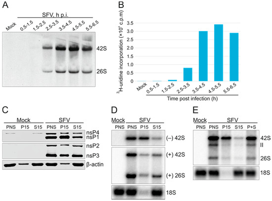 Metabolic labeling of SFV RNA synthesis with 3H-uridine was used to determine the optimal time point for the isolation of active SFV RCs. BHK cells were infected with an MOI of 50, and the incorporation of label into viral genomic (42S) and subgenomic (26S) RNA species became detectable after 1.5 h.p.i. (Figure 1A,B). The rate of 3H-uridine incorporation into viral RNA reached a maximum level at 4–5 h.p.i. Thus, SFV-infected cells were harvested at 4 h.p.i. and homogenized in isotonic buffer to prepare PNS. Typically, the PNS samples had a total protein concentration of ~3 mg/mL. To further isolate the RCs, PNS was separated into a P15 pellet and S15 supernatant by differential centrifugation at 15,000× g, and the distribution of viral nsPs as well as RNA was studied. The cytosolic marker β-actin and 18S rRNA were predominantly found in the S15 fractions (Figure 1C,D). Western blotting showed that all four nsPs were present in PNS, as well as in the P15 and S15 fractions (Figure 1C). The P15 fraction contained the majority of nsP1 (~90%) and about half of nsP4. Approximately 30% and 40% of nsP2 and nsP3 were found in P15, respectively. In-gel hybridizations showed that the P15 fraction contained the majority (~80%) of the minus-strand RNA present in the PNS, while a minor fraction of the genomic plus-strand RNA (~20%) was found in P15 (Figure 1D).