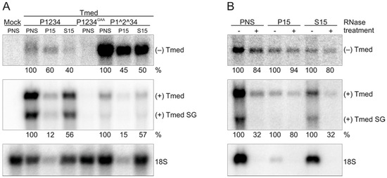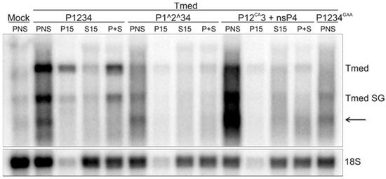 IVRA was designed based on that described in [25]. Typically, 2-fold and 30-fold dilutions of PNS, P15, and S15 prepared from transfected and virus-infected cells were used, respectively. A standard 30-µL reaction contained 22 µL of PNS, P15, or S15, 1 mg/mL BSA, 28 mM HEPES (pH 7.4), 200 mM sucrose, 2 mM DTT, 5.6 mM KCl, 3 mM magnesium acetate, 1.5 μg/mL Actinomycin D, 810 U/mL RiboLock, 17 mM creatine phosphate (Sigma-Aldrich), 8.3 U/mL creatine phosphokinase (Sigma-Aldrich), 1 mM ATP, 10 µM UTP, 10 µM GTP, 8.5 µM CTP, and 0.055 µM (5 µCi) of α-32P-CTP (Perkin Elmer). For IVRA with exogenous template RNA, an in vitro transcript of Tmed was prepared using a SacI-linearized template plasmid and a mMESSAGE mMACHINE® T7 Transcription Kit (Ambion, Thermo Fisher Scientific, Waltham, MA, USA) according to the manufacturer’s instructions, and 1 µg of RNA was added per reaction. After 1-h incubation at 30 °C, IVRA reactions were terminated by the addition of LiDS/LET containing 80 µg/mL proteinase K and incubating for 15 min at 37 °C. Unicorporated label was removed using RNase-free Micro Bio-Spin™ P-30 Gel Columns (Bio-rad, Berkeley, CA, USA), and RNA was isolated using the acid phenol method.
