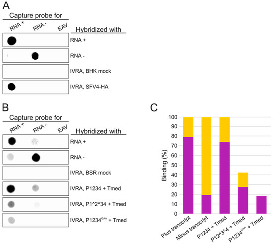 Determination of the polarity of in vitro synthesized RNA. (A) RNA probes with the sequence of the 3′ end of the SFV genome, recognizing minus-strand RNA (RNA−), or its complementary sequence, recognizing plus-strand RNA (RNA+), were immobilized on membranes. As a negative control, an unrelated transcript (equine arteritis virus (EAV)) was also immobilized. The membranes were then hybridized with 32P-labeled SFV transcripts of positive or negative polarity as well as 32P-labeled IVRA products. IVRA reactions with PNS samples from mock and SFV-infected cells were included; (B) RNA probes with the plus sequence of Tmed, recognizing minus-strand RNA (RNA−), or its complementary sequence, recognizing plus-strand RNA (RNA+), were immobilized on membranes as well as EAV transcript followed by hybridization with 32P-labeled Tmed plus and minus transcripts as well as 32P-labeled IVRA products. PNS samples from both mock and transfected cells were included; (C) binding of Tmed plus and minus transcripts as well as IVRA products to the capture probes was quantified from two independent experiments. The binding of the IVRA products made by replication complexes (RCs) from P1^2^34 or P1234GAA + Tmed-transfected cells were normalized to the binding of the IVRA products made by RCs from P1234 + Tmed-transfected cells. Magenta indicates binding to the capture probe for the plus-strand RNA and orange to the capture probe for the minus-strand RNA.