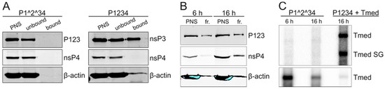 Exogenous template RNA is not replicated in vitro. (A) BSR cells were transfected with the polyprotein construct P1^2^34 or P1234 and cells were collected at 16 h post transfection followed by homogenization and HA-affinity capture. The HA tag was in nsP3. After PNS was incubated with HA-specific agarose beads, they were washed and boiled with Laemmli sample buffer. The presence of polyprotein P123, nsP3, nsP4, and β-actin in PNS as well as in unbound and bound fractions was studied by Western blotting. P123 and nsP3 were detected using an antibody against the HA tag; (B) BSR cells were transfected with the polyprotein construct P1^2^34, cells were collected at 6 or 16 h post transfection, and membranes were purified from PNS using flotation centrifugation. A Western blot analysis shows the presence of P123, nsP4, and β-actin in the PNS and membrane fractions (fr.); (C) IVRA was performed with the flotation fractions by adding 1 µg of Tmed in vitro transcript. As a control, replication activity from the endogenous template is shown for PNS prepared from BSR cells co-transfected with the P1234 and Tmed constructs. The lower panel shows the presence of exogenous Tmed transcript in the membrane fractions after the IVRA, detected by in-gel hybridization from the same gel using a probe specific to the plus-stranded Tmed.