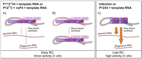 The early RCs of alphaviruses are formed when the polymerase nsP4 is first cleaved from the nonstructural polyprotein. The resulting complex of P123 and nsP4 mainly synthesizes minus-strand RNA using the genomic RNA as a template [8,21]. Next, P123 is cleaved to individual proteins, and the fully processed nsPs form the late RC, which synthesizes only genomic and subgenomic plus strands from the minus-strand RNA [8]. It has been shown that the template’s length determines SFV spherule size [22], and the current view is that the minus-strand RNA synthesized from the genomic template is inside the mature spherule as part of double-stranded RNA (dsRNA) molecules that form the replicative intermediates, and newly made plus strands are released into the cytoplasm [23,24,25].