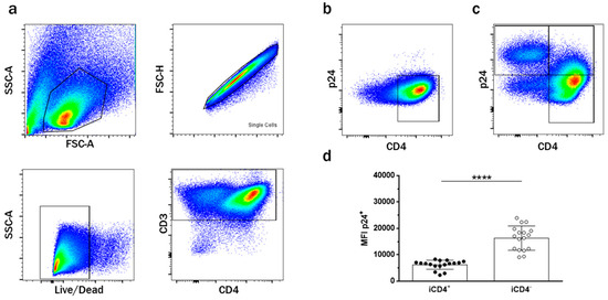 Gating strategy. (a) Gating strategy identifying live singlet CD3+ T lymphocytes. HIV-uninfected CD4+ T cells were identified from this gate (b); as were the different subsets of HIV-infected CD4+ T cells (c); (d) comparison of the mean fluorescence intensity (MFI) of p24 expression on HIV-infected p24+CD4+ (iCD4+) and HIV-infected p24+CD4− (iCD4−) T cells (n = 17). A Wilcoxon test was used to determine significance of within subject differences for the indicated T cell subsets. Each data point represents a separate infection of CD4+ T cells isolated from one individual. Bar height and error bars represent the mean and standard deviation for the data set. Significant values are shown; **** p < 0.0001.