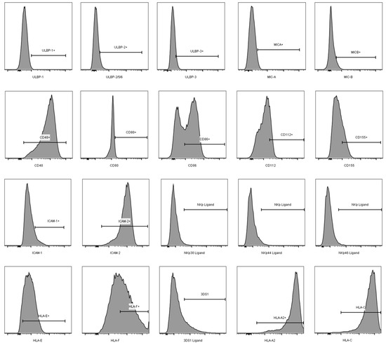 Histograms showing sample flow cytometry profiles for the ligands studied. Bars in each plot indicate the population expressing each aNKR, Gates were set using Unstained, single stained controls, fluorescence minus one, and secondary antibody alone controls.