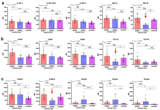 Mean fluorescence intensity (MFI) of aNKR ligand expressing T cell subsets. Comparison of the per-cell expression of Panel 1, 2, and 3 ligands to aNKR on HIV-infected p24+CD4+ T cells (iCD4+), p24+CD4− T cells (iCD4−) and HIV-uninfected p24−CD4+ T cells (unCD4). Panel 1 (a) includes ULBP-1 (n = 11), ULBP-2/5/6 (n = 11), ULBP-3 (n = 11), MIC-A (n = 9), and MIC-B (n = 9); Panel 2 (b) includes CD48, CD80, CD86, CD112, and CD155 (n = 9, for all); Panel 3 (c) includes ICAM-1, ICAM-2, and the ligands to NKp30, NKp44, and NKp46 (n = 9, for all). The MFI of the expression of the indicated ligand is represented on the y-axis. Friedman (PFriedman) and Dunn’s post (*) tests were used to determine significance of within subject differences between data sets. Each data point represents T cells isolated from a separate individual. Bar height and error bars represent the mean and standard deviation for the data set. Significance values are shown over the bars linking 2 groups as * p < 0.05; ** p < 0.01; *** p < 0.001; **** p < 0.0001. Red arrows highlight ligands for aNKR expressed at a lower MFI on iCD4− than unCD4 cells.