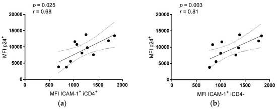 The per-cell expression of ICAM-1 is correlated with the MFI of p24 expression in HIV infected T cell subsets. Correlation of MFI of ICAM-1 expression with the MFI of p24 expression in (a) iCD4+, and (b) iCD4− HIV infected T cell subsets. Each data point represents T cells isolated from a separate individual (n = 11). Dotted lines represent 95% confidence intervals. Significant values (p) and correlation coefficients (r) are shown.
