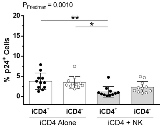 Natural killer (NK) cells preferentially target HIV-infected CD4 T cells that conserve cell-surface CD4 expression. The frequency of HIV-infected (p24+) cells within both iCD4+ and iCD4− T cell subsets from iCD4 cultured alone (white bars) or co-cultured with NK cells (grey bars) for 10 days (n = 11). Friedman (PFriedman) and Dunn’s post (*) tests were used to determine significance of within subject differences between data sets. Each data point represents T cells isolated from a separate individual. Significant values are shown; * p < 0.05; ** p < 0.01.
