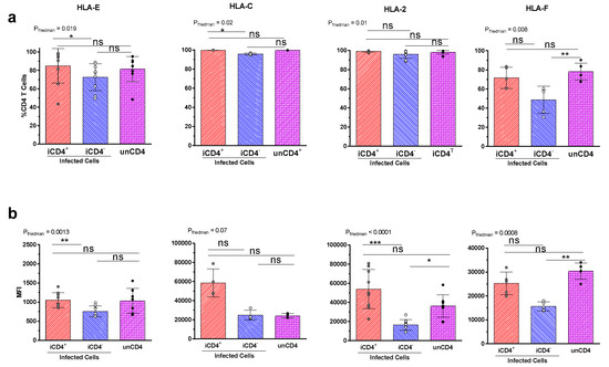Expression profile of the human leukocyte antigen (HLA) molecules HLA-E, HLA-C, HLA-A2, and HLA-F on CD4+ T cell subsets. (a) The frequency of HIV-infected p24+CD4+ (iCD4+), p24+CD4− (iCD4−) and uninfected (unCD4) T cells expressing HLA-E (n = 9), HLA-C (n = 4), HLA-A2 (n = 9), and HLA-F (n = 5); (b) the mean fluorescent intensity (MFI) of iCD4+, iCD4− and unCD4 cells expressing the indicated ligands for the same study subjects as in (a). The percentage and MFI of cells expressing the indicated ligand is represented on the y-axis. Significant values are shown; * p < 0.05; ** p < 0.01; *** p < 0.001.