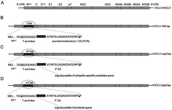 Npro is an autoprotease unique to pestiviruses that cleaves itself from the polyprotein [32,33]. Using a reverse genetics system, the enhanced green fluorescent protein (EGFP) was expressed separately by the recombinant BVDV depending on the cleavage of Npro and the foot-and-mouth disease virus (FMDV) 2A protein. It was evidenced that the insertion between the Npro and C genes of BVDV did not interfere with the characteristics of the viral vector and foreign protein expression [34]. In addition, another study showed that the porcine teschovirus P2A is shorter and possesses higher cleavage efficiency than the FMDV 2A [35]. In this study, the Cap protein was expressed separately in the recombinant C-strain rHCLV-2ACap, rHCLV-uspCap, or rHCLV-pspCap depending on the self-cleaving Npro and P2A.