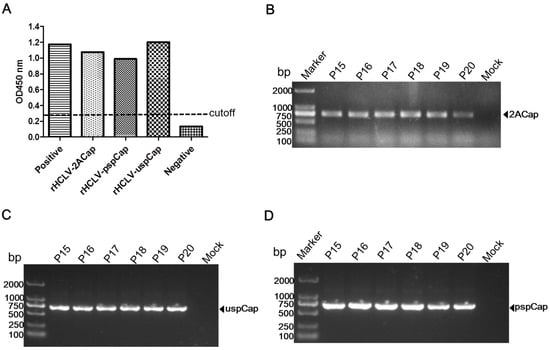 Identification of the generated recombinant viruses. (A) The Erns protein of three recombinant viruses was tested by antigen-capture ELISA. The supernatants from the cells inoculated with the recombinant viruses were tested by an antigen-capture ELISA (IDEXX); (B–D) the inserted genes remained stable in the recombinant viruses. The Cap gene was amplified from viral RNA of passage 15 (P15) to P20 rHCLV-2ACap (B), rHCLV-uspCap (C), and rHCLV-pspCap (D) by RT-PCR.